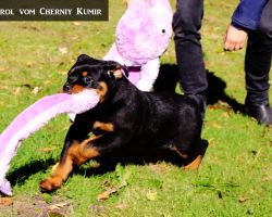 We breed Rottweilers with famous German pedigrees and lines. All adult Rottweilers and rottweiler puppies possess sound temperaments, healthy powerful bodies, excellent massive bone structure, working ability, and extremely high intelligence. These dogs are calm, trainable, protective, courageous and devoted to their owners and family. Obedience training is essential.