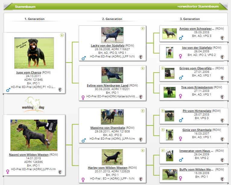 korrekte Größe, substanzvoll, passende Knochenstärke, umgänglich, kräftiger, gut ausgefüllter Kopf mit leichter Backenhaut, mittelgroße, korrekt angesetzt und getragene Ohren, sehr gute Maulpigmente, Lefzen und Zahnleiste sehr dunkel, kräftiger, sehr gut aufgebauter Hals, Ellenbogen anliegend, Schulterlage in Ordnung, gerade Vorhand, kräftige, nicht ganz geschlossene Pfoten, sehr gute obere und untere Linie, kräftig bemuskelte Hinterhand, Winkelung vorne und hinten korrekt, kräftiger Rutenansatz mit hängender Rute, gesundes Stockhaar, mittelbraune, gut verteilte Abzeichen, an der Brust etwas aufgehellt, Kruppe sehr gut gelagert, freies Gangwerk mit sehr guter Trittfolge