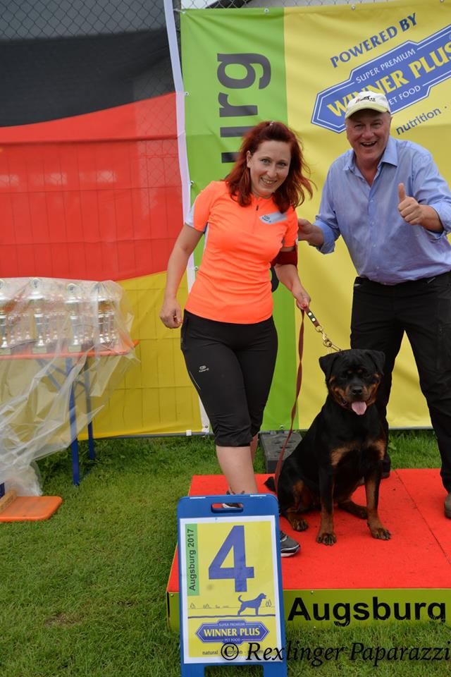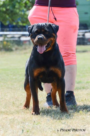 große, kräftige, gut aufgebaute Hündin, umgänglich, kräftiger, etwas gedrungener Kopf, Fang von ausreichender Länge, dunkle Maulpigmente, mittelgroße Ohren, korrekt getragen, unter Aufmerksamkeit leichte Stirnfalten, breite, tiefe Brust, gute Schulterfestigkeit, gerade Vorhand, kleine, feste Pfoten, sehr gute Nackenrückenlinie, gut ausgefüllte Lendenpartie, kräftiger Rutenansatz, Rute hängend getragen, volle Keulen, sehr gute Winkelungen, gesundes Stockhaar, rostbraune Abzeichen, an der Brust leicht dunkel durchsetzt, sehr gute Ganganlagen, baut sich in der Bewegung etwas auf, Rücken leicht nachgebend